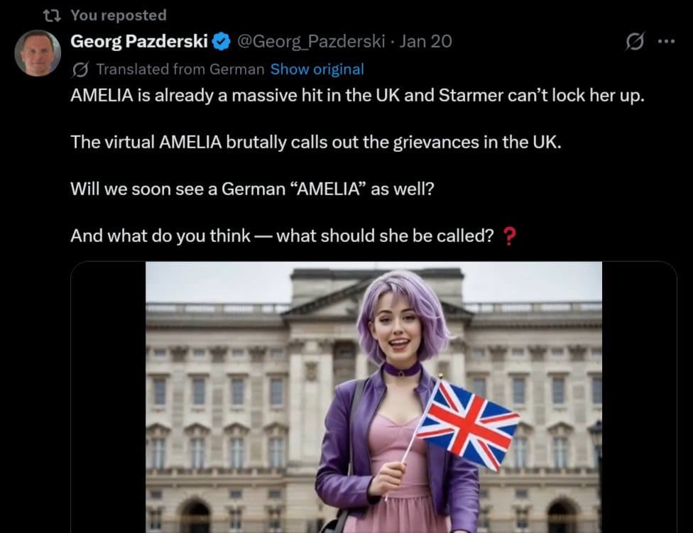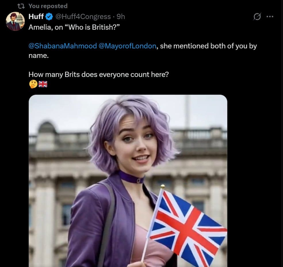 I love the rise of Schadenfreude on social media when it hammers leftist globalists into oblivion. On X, Grok has set free Amelia, an AI-generated, purple-haired goth “nationalist extremist” from an online prevention game created by Hull City Council in England. She was meant to turn young Brits away from right-wing views and instead has gone viral, pushing conservative activism, especially when it comes to closing borders, sovereignty, and anti-Islamism. She’s glorious.