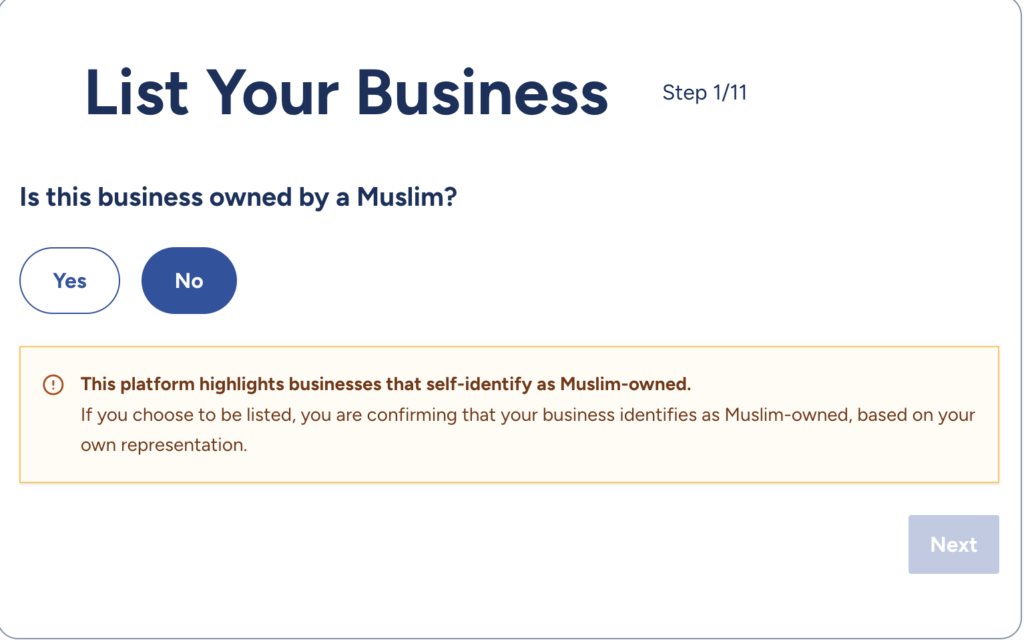 The disclaimer reads: “This platform highlights businesses that self-identify as Muslim-owned… you are confirming that your business identifies as Muslim-owned, based on your own representation.” RAIR Foundation USA tested it: selecting No ends the process immediately. Non-Muslim businesses cannot list or appear—making them invisible to users and enforcing exclusive redirection of spending inward. This hard gate cements the platform’s engineered economic segregation.