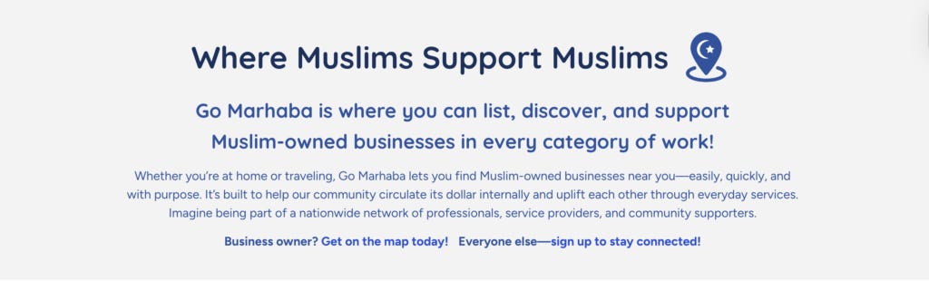 On their official website (GoMarhaba.com), the platform presents a polished, feel-good version of the same idea: “Go Marhaba is a movement to make Muslim-owned businesses easy to find, support, and celebrate. It’s a one-stop directory that helps us keep our dollars circulating within the community, building strength from the inside out.”