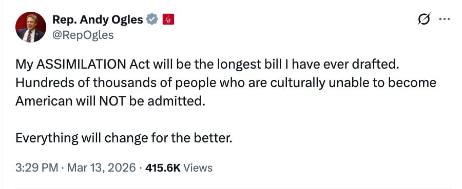 On March 16, Rep. Andy Ogles (R-TN) posted a powerful video on X underscoring the crisis America faces from years of unchecked immigration, and major steps that need to be taken to address it. The Freedom Caucus member stated:“It’s time for a major immigration paradigm shift. Our founders were prepared to drop the British flag to become Americans. Newcomers must be prepared to drop their flags and do the same. The ASSIMILATION Act will change everything. Stay Tuned.”