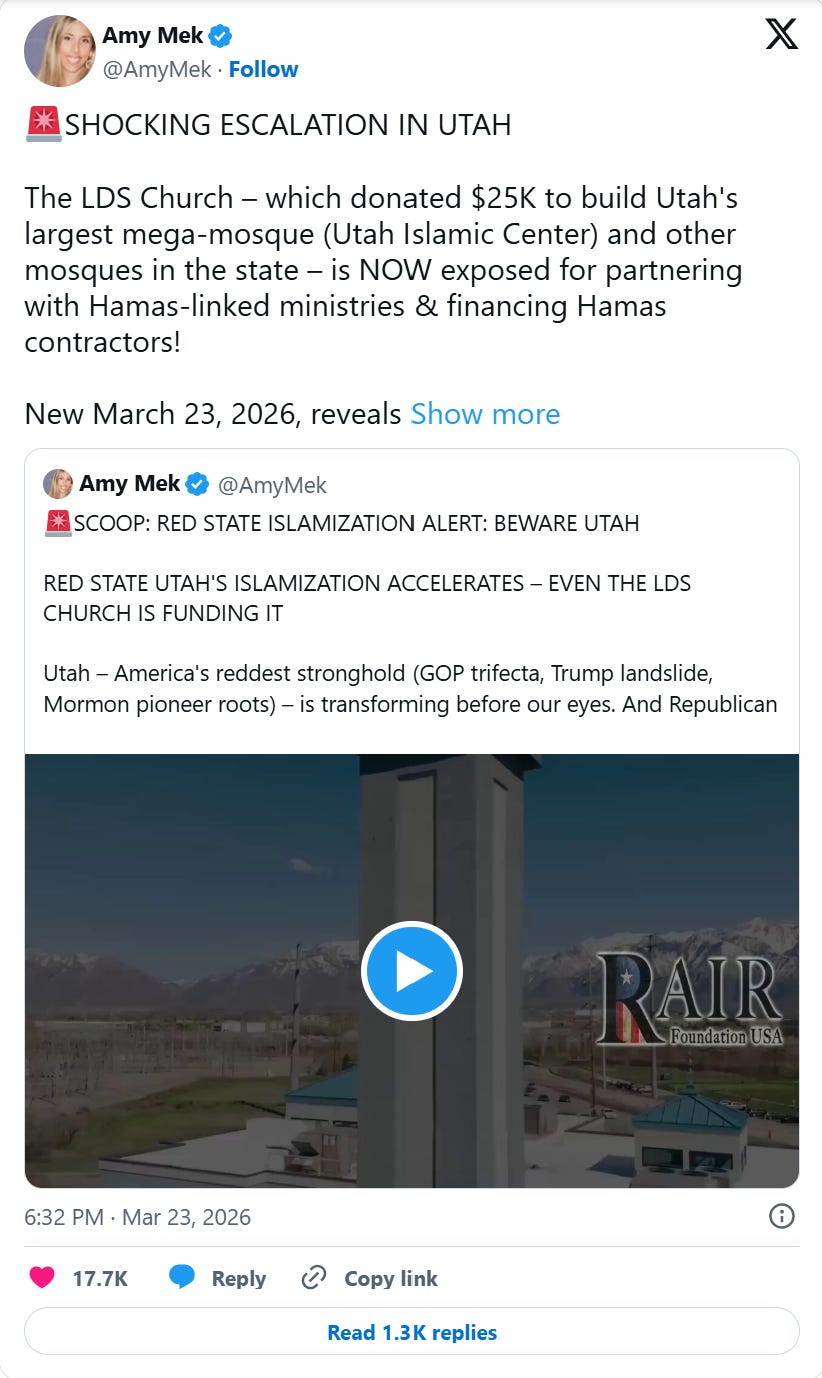 In a series of detailed posts, Mek reported that the Church of Jesus Christ of Latter-day Saints (LDS Church) has a long-standing policy of donating $25,000 toward the construction of every new mosque built in Utah. This includes a contribution to Utah’s largest mega-mosque, the Utah Islamic Center, a 14,356-square-foot facility that can accommodate 1,050 worshippers.