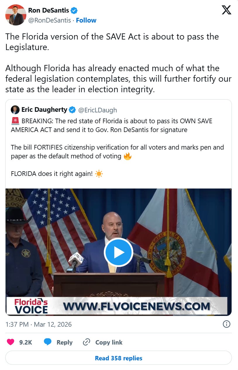 On March 12, 2026, the Florida Legislature passed HB 991, the state’s strong, common-sense version of the SAVE America Act. The House approved it 77-28 and the Senate 27-12, sending the bill to Governor Ron DeSantis, who is expected to sign it without delay.