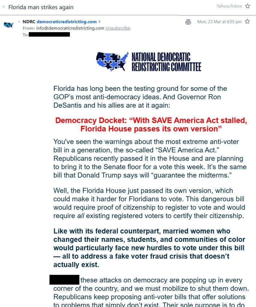 Indeed, the mass email cites Elias’s Democracy Docket, which refers to the Florida legislation as “a sweeping voter suppression bill”.