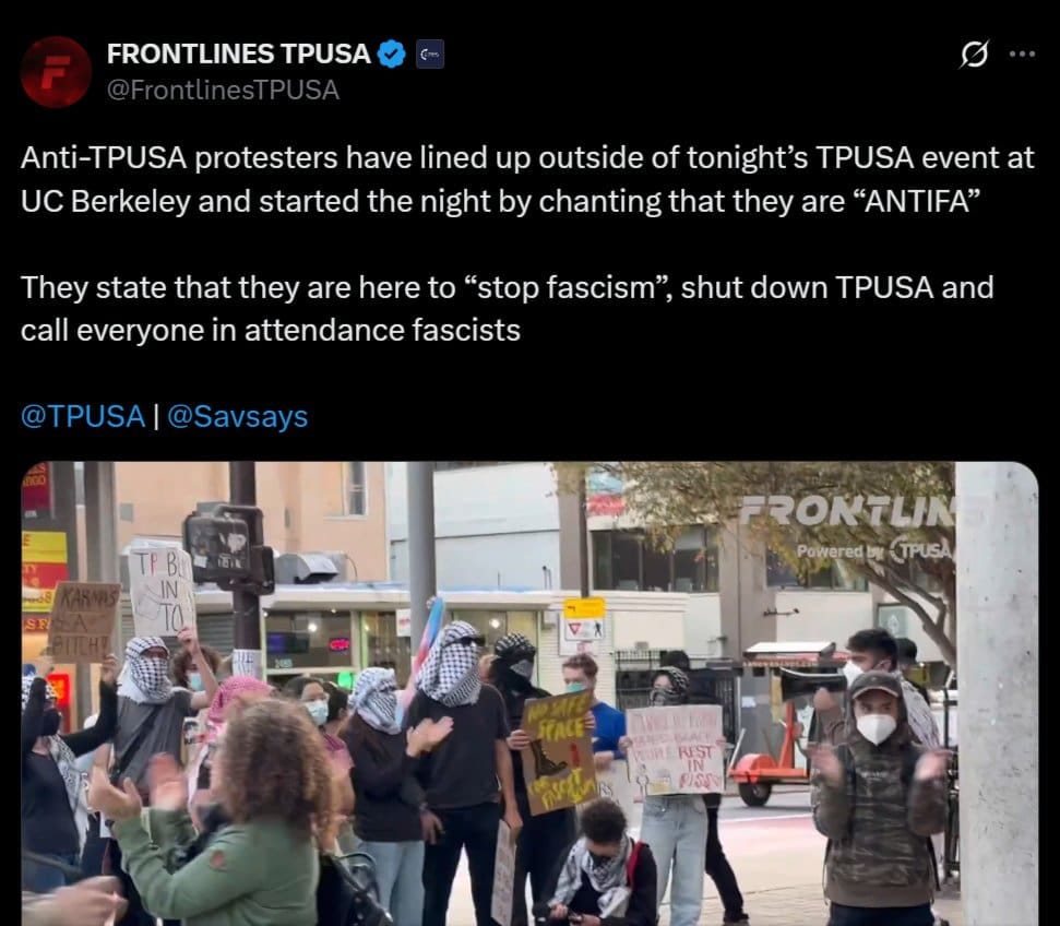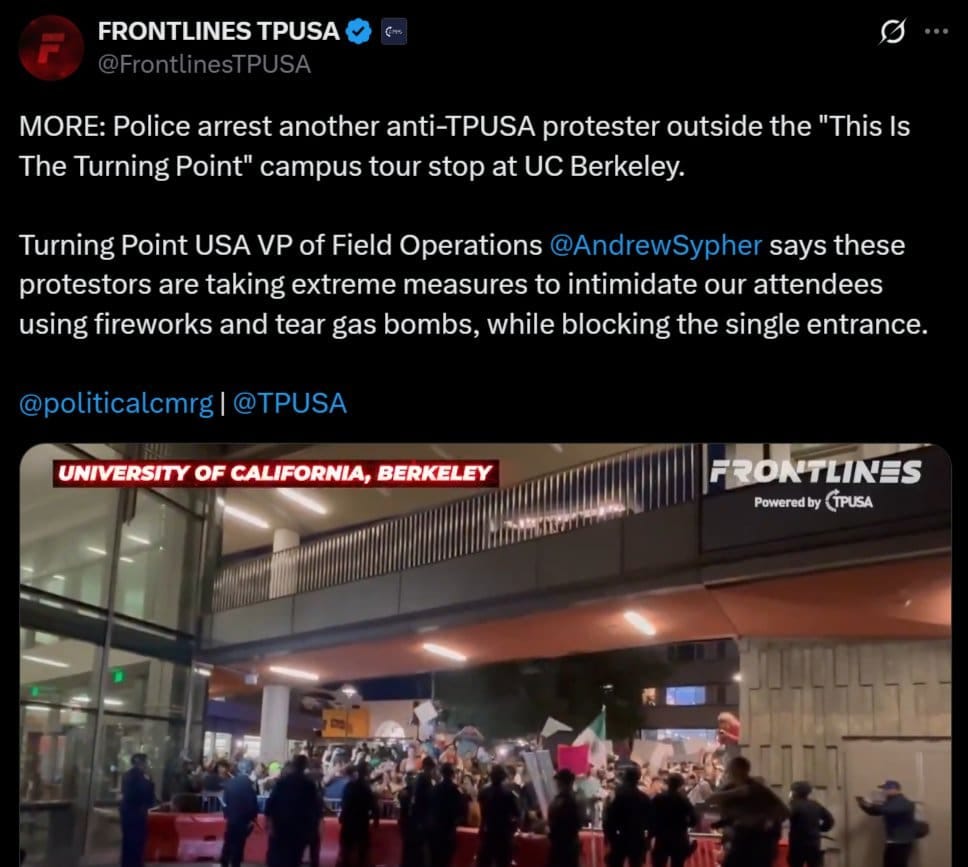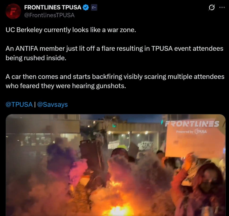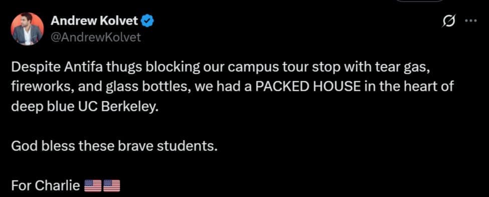 “Despite Antifa thugs blocking our campus tour stop with tear gas, fireworks, and glass bottles, we had a PACKED HOUSE in the heart of deep-blue UC Berkeley,” TPUSA spokesperson Andrew Kolvet said, according to the New York Post.