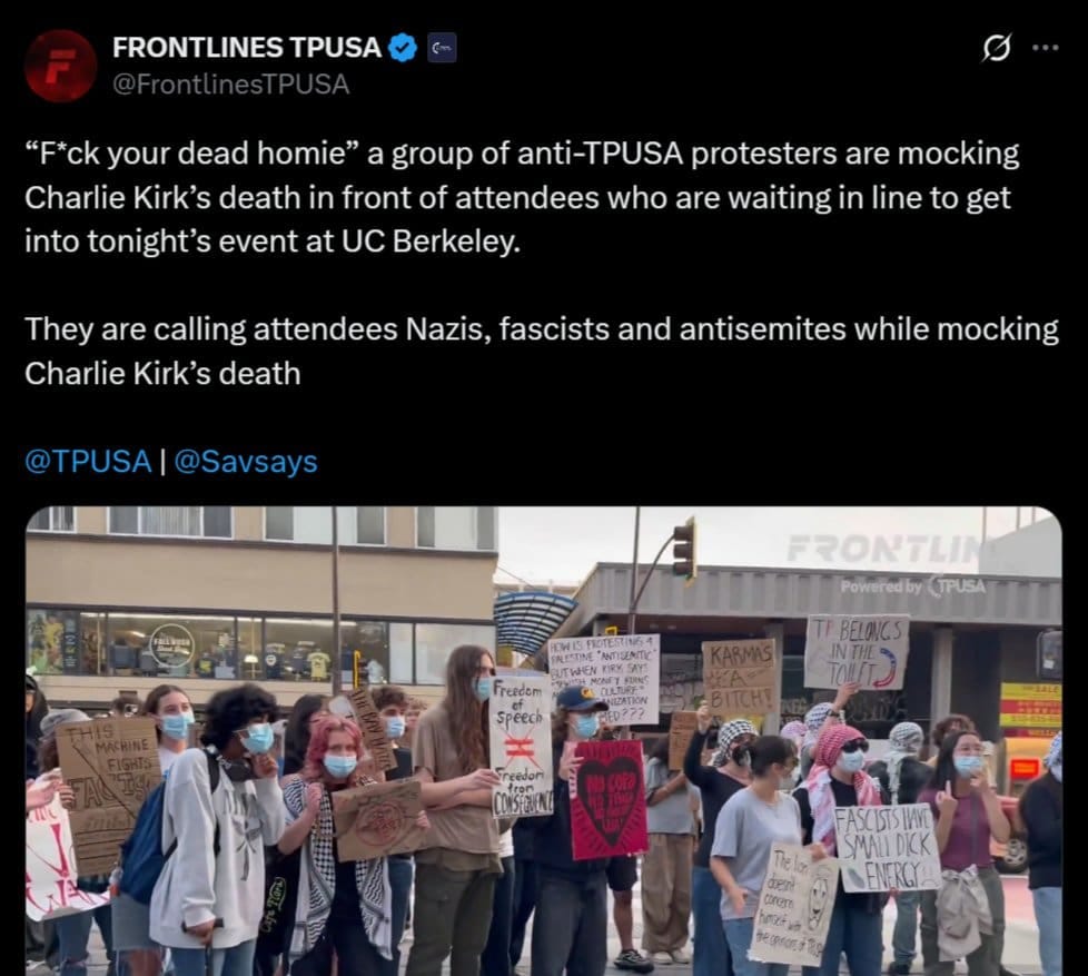 They brandished signs declaring, “This machine fights fascism,” “No safe space for fascists,” “Karma’s a b***h,” and “The lion doesn’t concern himself with the opinions of trash.” Other signs stated, “Kirk said death penalties should be public, quick, and televised … Congrats, Bud!” and “TP belongs in the toilet.”