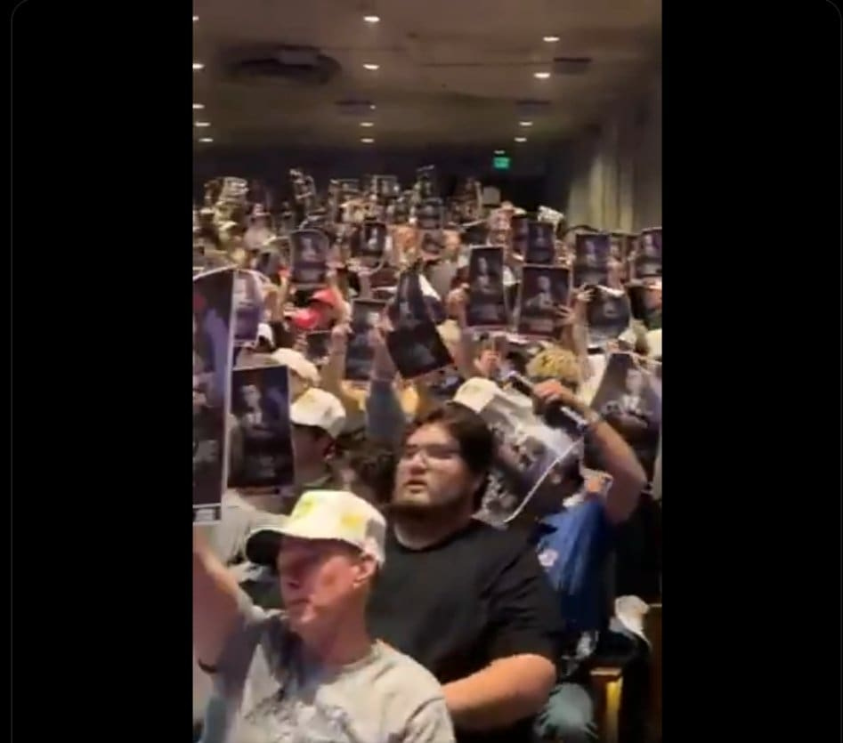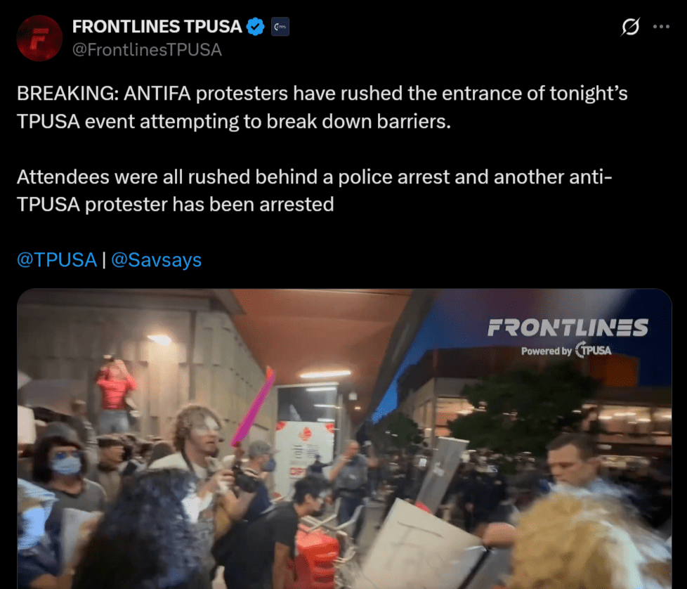The Post Millennial reported, “A person was heard chanting, ‘any time, any place, punch a fascist in the face.’ A car exhaust backfiring outside the venue while performing a burnout raised fears in the crowd of gunshots being fired.”