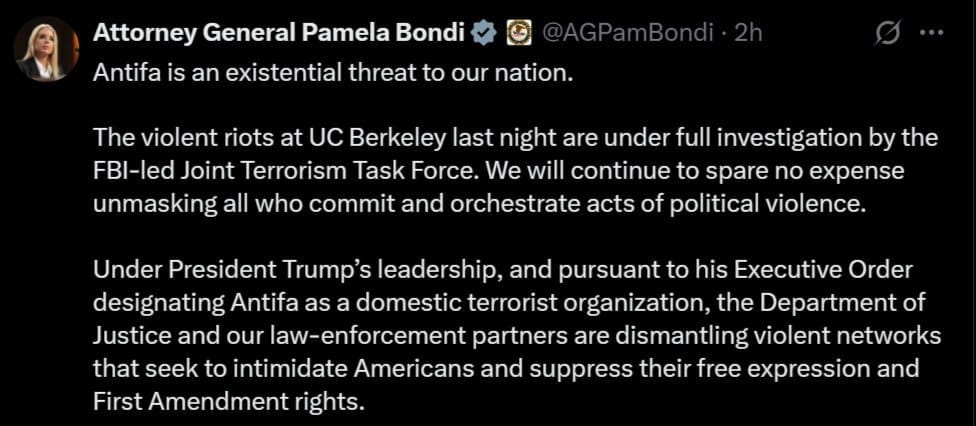 U.S. Assistant Attorney General Harmeet Dhillon for the DOJ’s Civil Rights Division shared clips of the protest on social media and said an investigation was on the way. Attorney General Pam Bondi followed with her own post, announcing the incident is under “full investigation by the FBI-led Joint Terrorism Task Force.” Both pointed blame at Antifa.