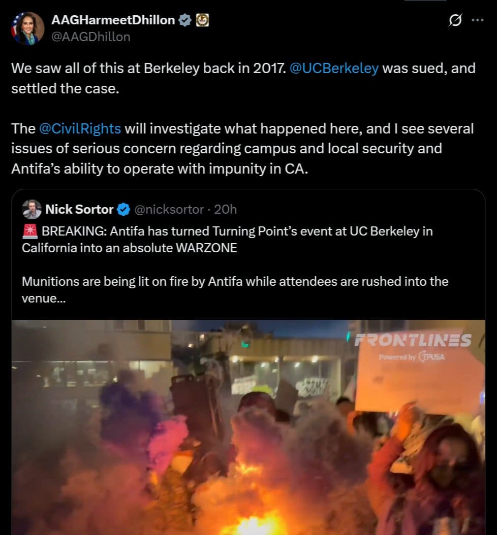 “The @CivilRights will investigate what happened here, and I see several issues of serious concern regarding campus and local security and Antifa’s ability to operate with impunity in CA,” Dhillon posted on X.